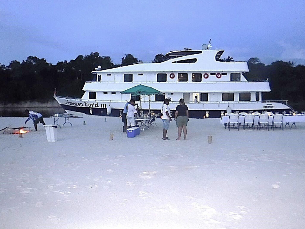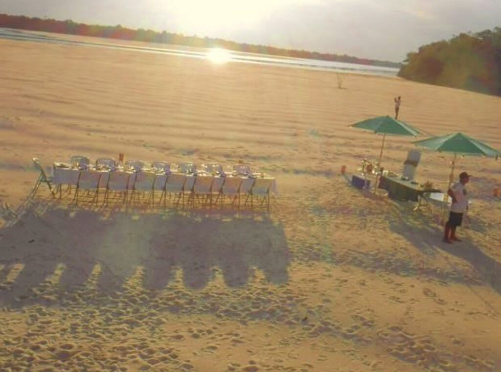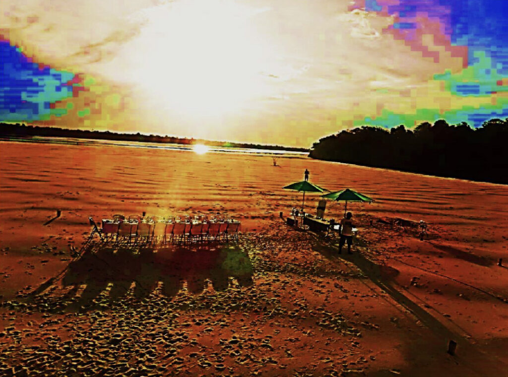 The guides set up a beautiful shore lunch under the trees on a white sand beach in the Jungle, want a drink?